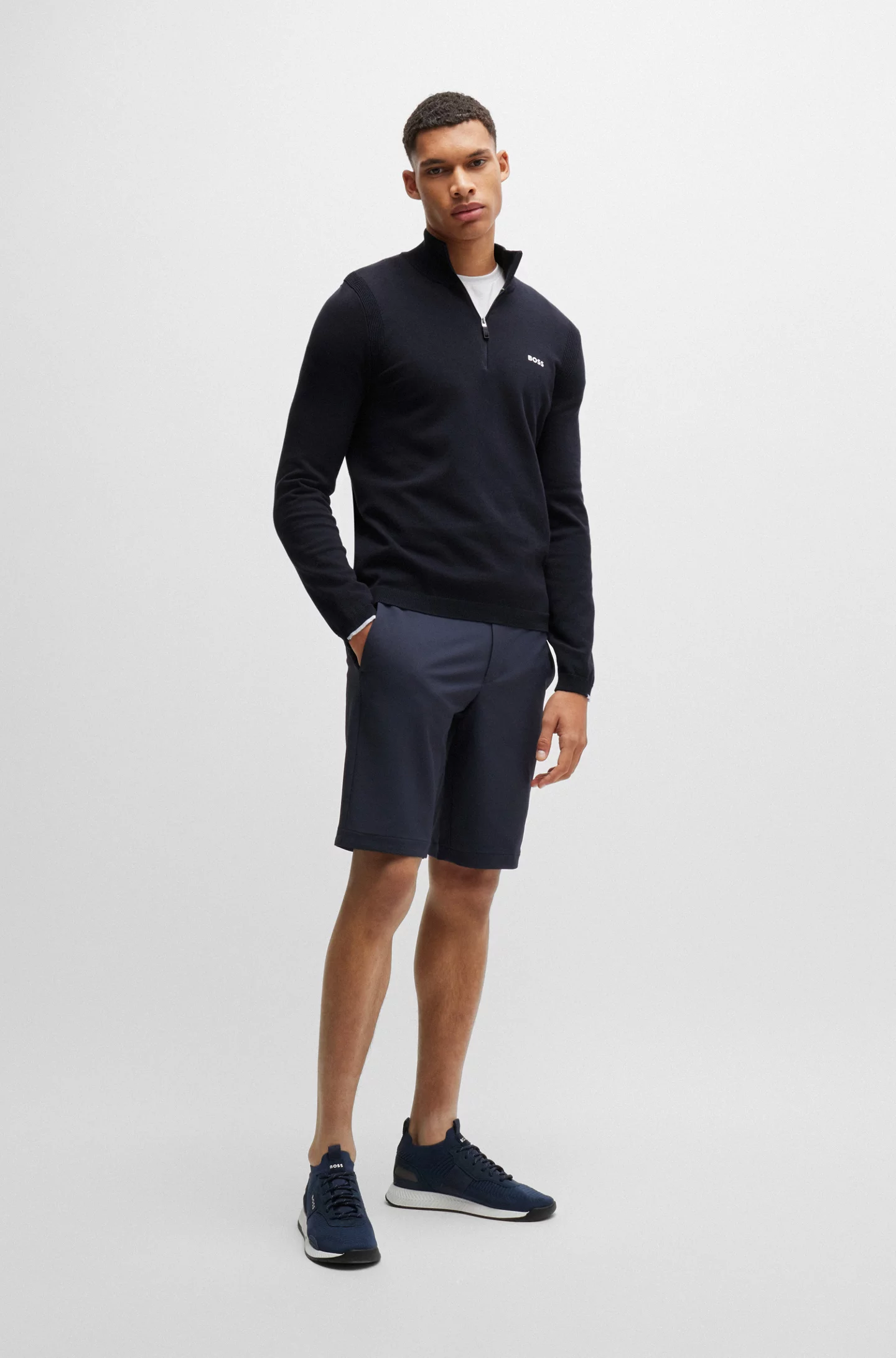 Elevate your fall and winter wardrobe with this Boss men’s blue zip-up cardigan. Designed for comfort and versatility, this stylish piece combines warmth with a sleek, modern look. Whether you’re layering it over a casual tee or wearing it for a more polished appearance, this cardigan is perfect for any occasion. The turtleneck provides added warmth around your neck, while the long sleeves keep you cozy throughout the colder months.