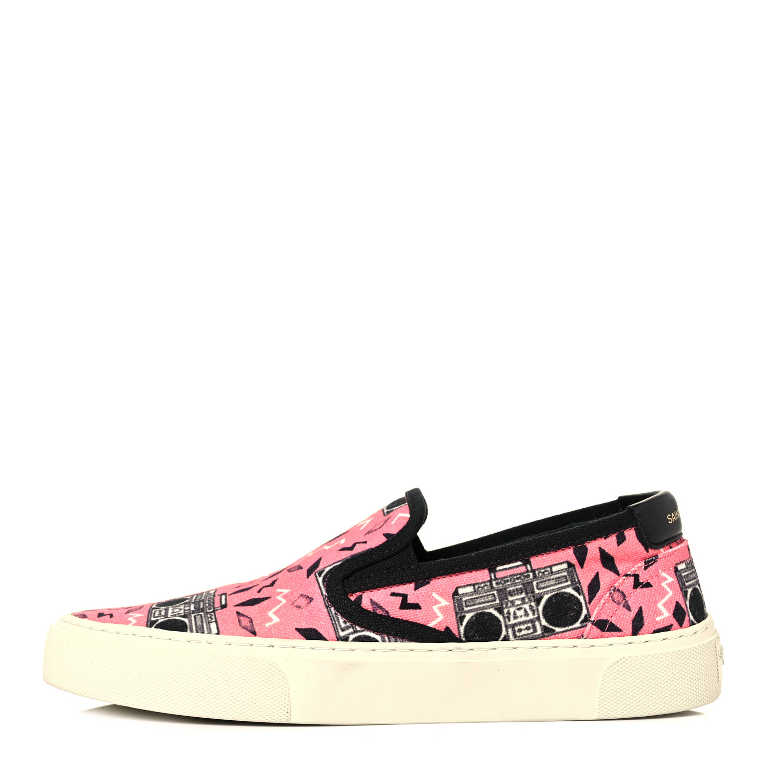 Step into the spotlight with the Saint Laurent Pink Canvas Slip-On with Radio Print. These sneakers are the epitome of casual sophistication, blending vibrant design with luxurious craftsmanship. Perfect for adding a playful yet polished touch to any outfit, these slip-ons make a bold statement with their allover radio print against a soft pink cotton canvas backdrop.