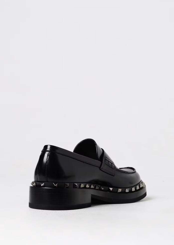 What sets these loafers apart is the iconic Rockstud detailing—instantly recognizable and bold, yet balanced perfectly with the classic sophistication of the shoe. The studs along the sole’s perimeter inject the design with a bit of rebellion, offering a nod to Valentino’s signature edgy style while maintaining an air of understated elegance. The leather block heel adds just the right height without compromising on comfort, ensuring that these loafers are suitable for all-day wear.