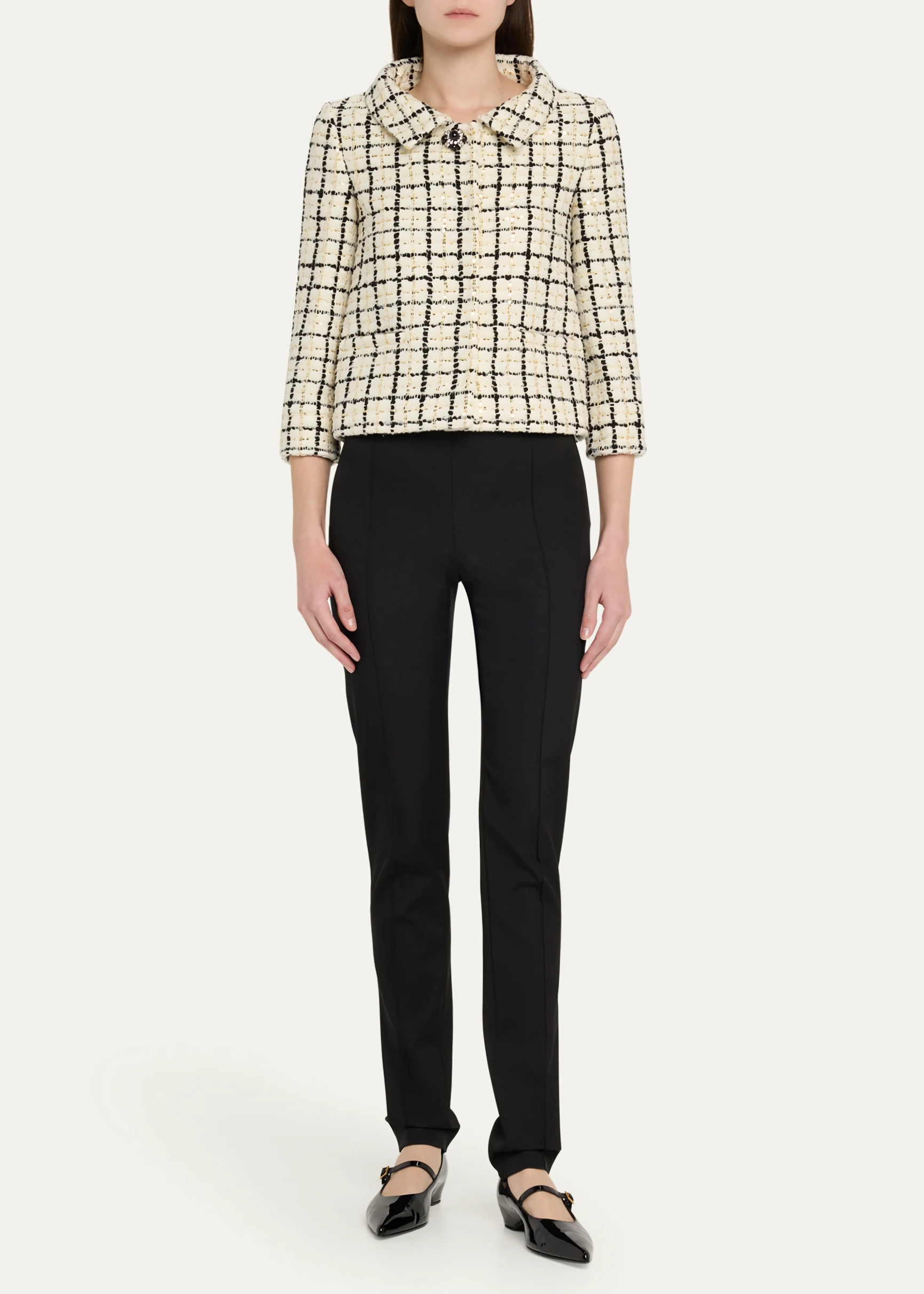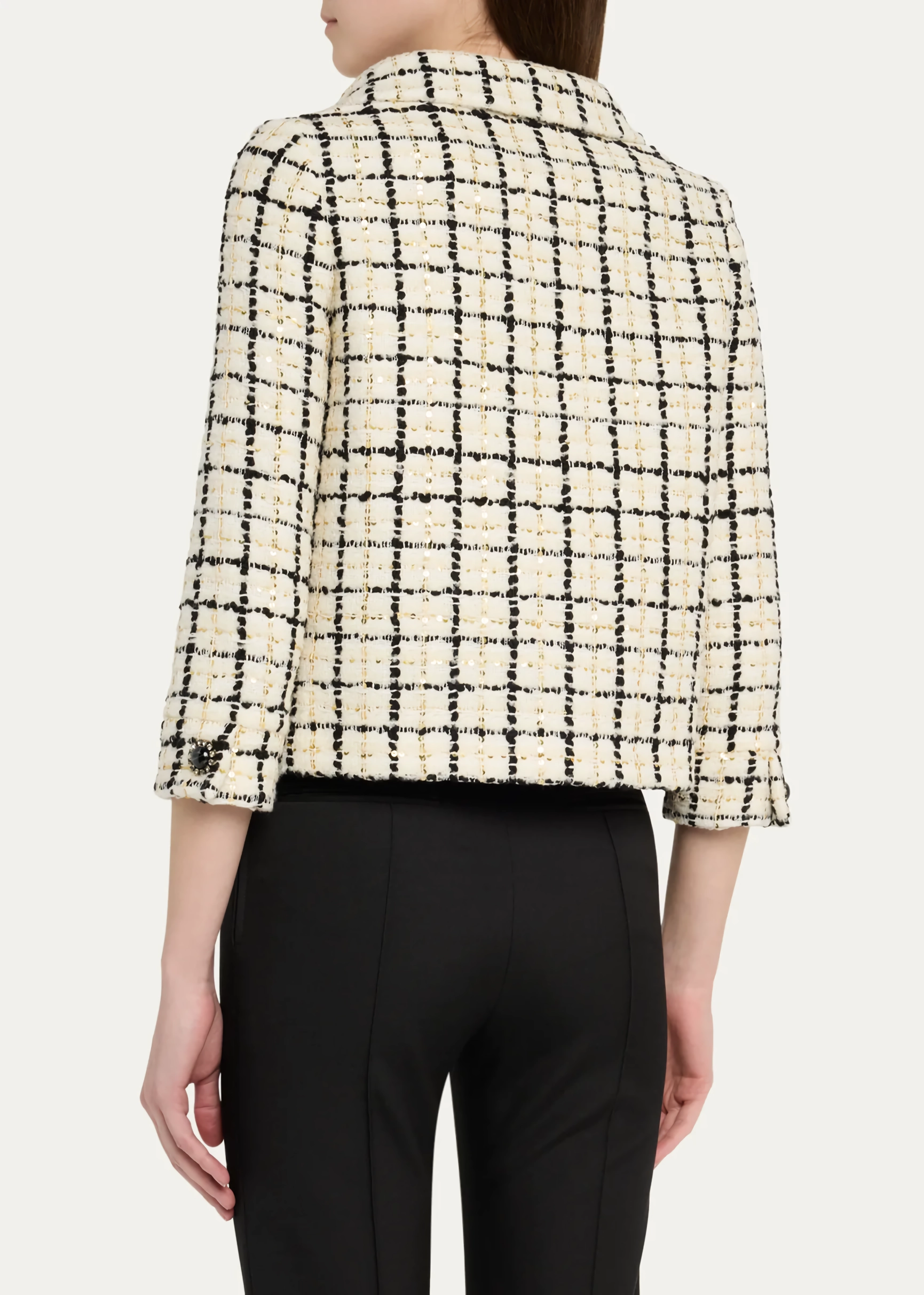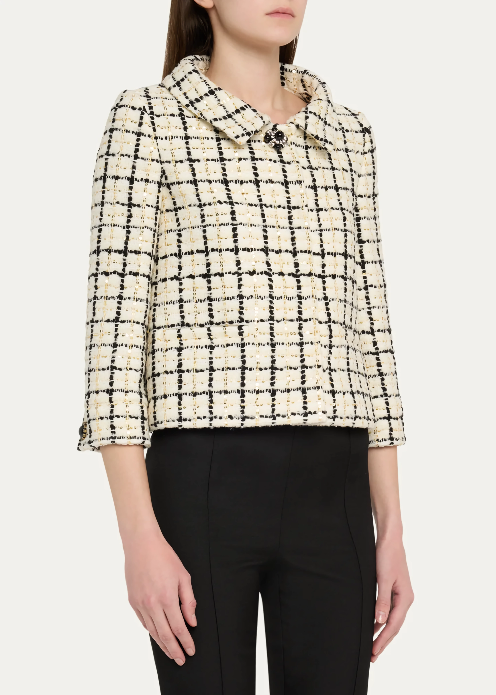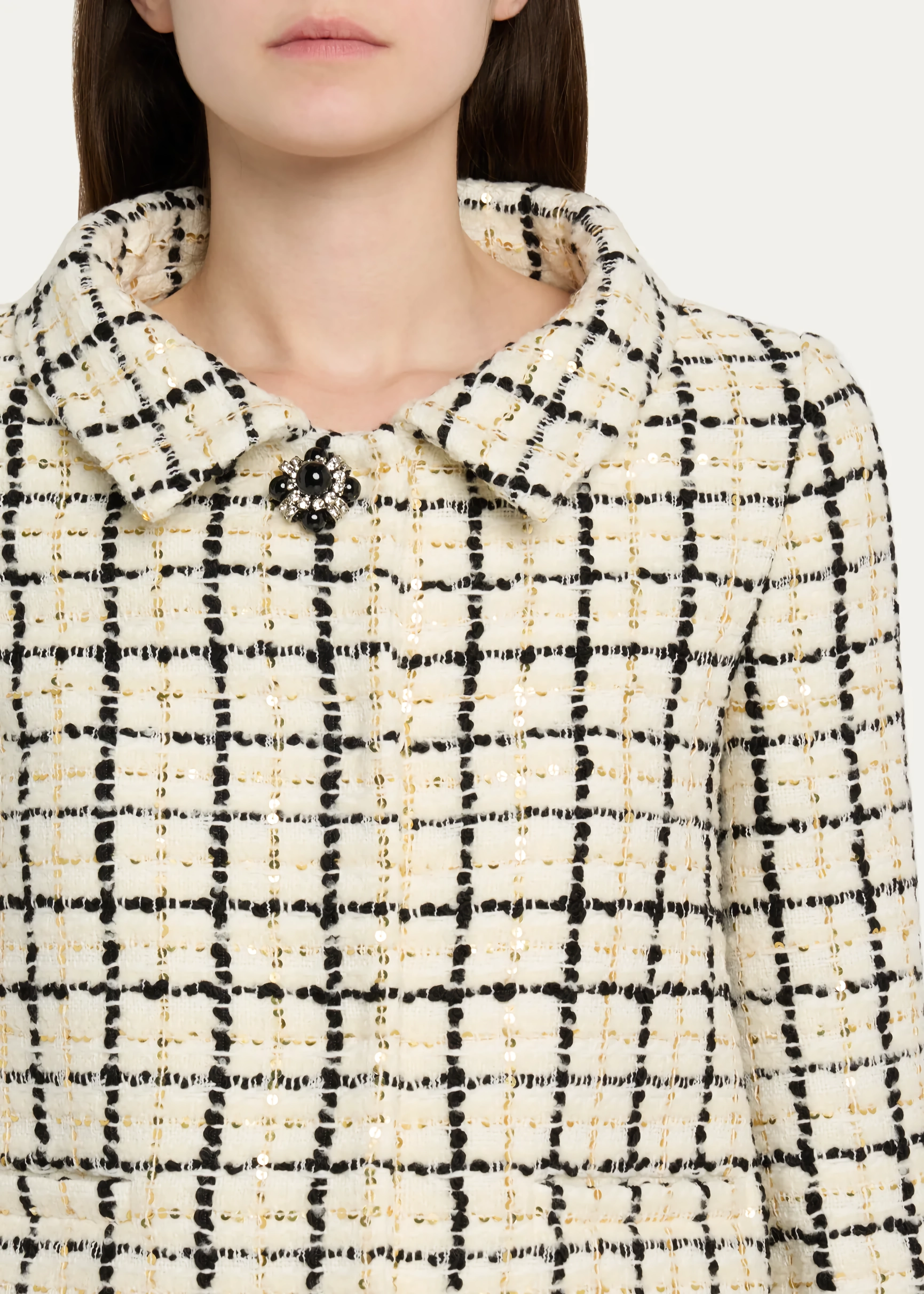 • Check Pattern with Sequins: The dynamic interplay of classic tweed and sparkling sequins ensures a captivating visual effect.