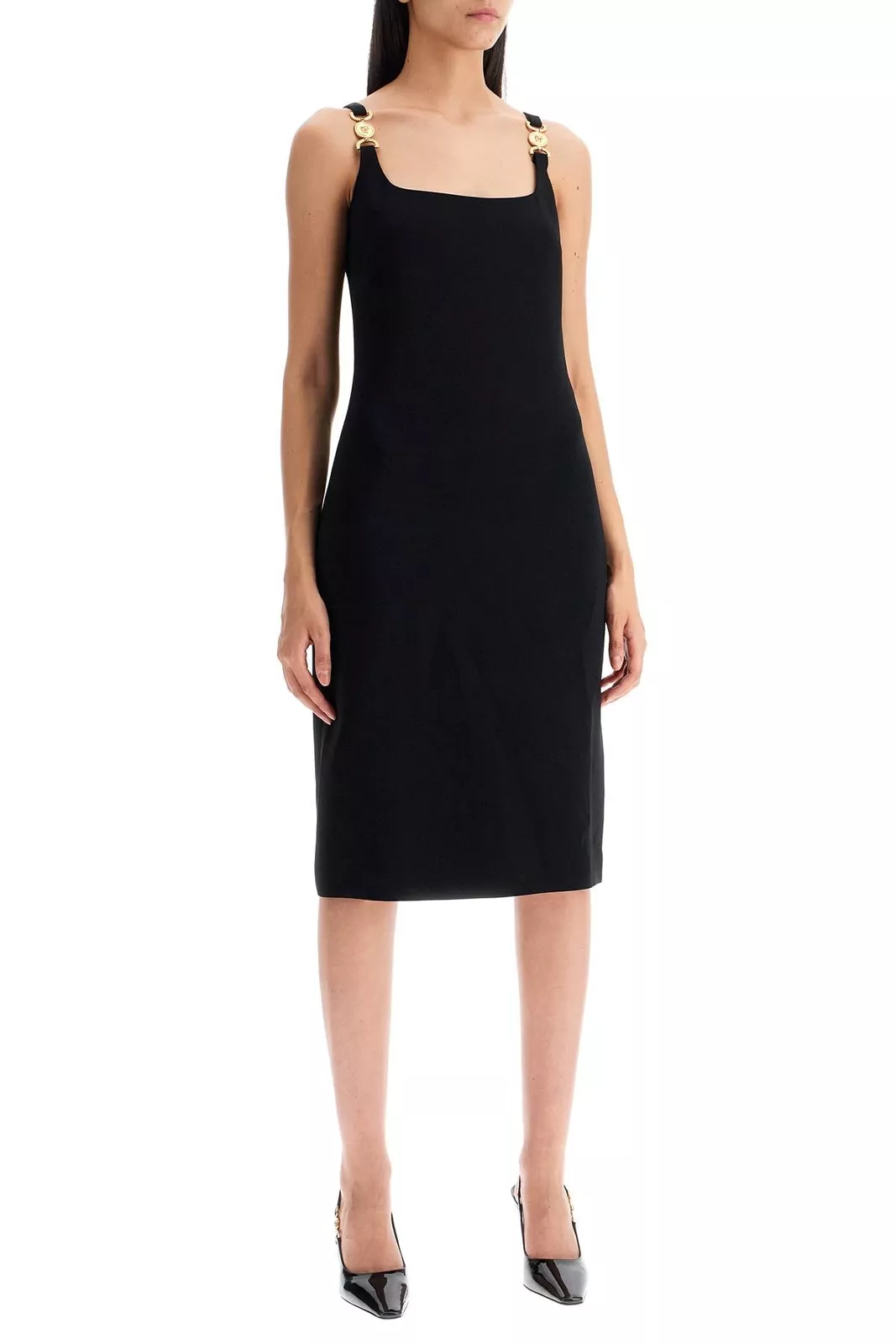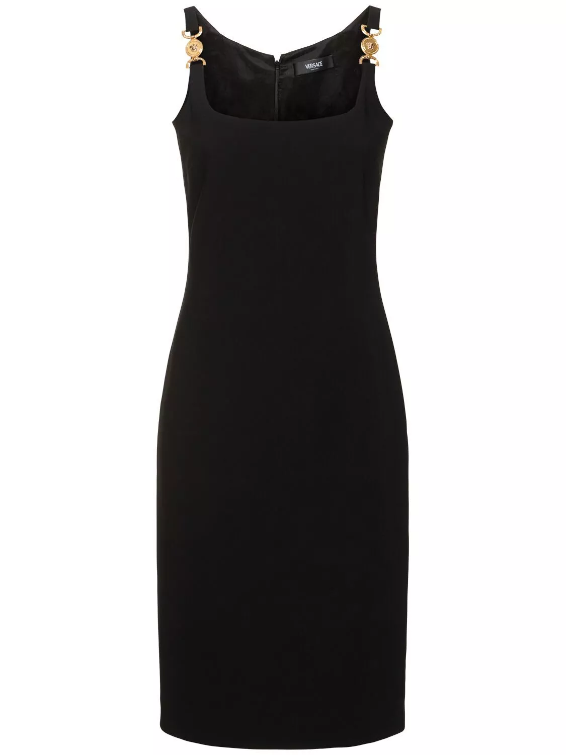 Versace Sleeveless Dress. This dress features a flattering sleeveless design that showcases your shoulders while keeping you cool and comfortable. The standout straps, adorned with the contrasting three-dimensional iconic Medusa head detail, add a unique touch that embodies Versace’s signature luxury. The back zipper closure ensures easy dressing, while a stylish back panel slit brings an element of allure to your look.